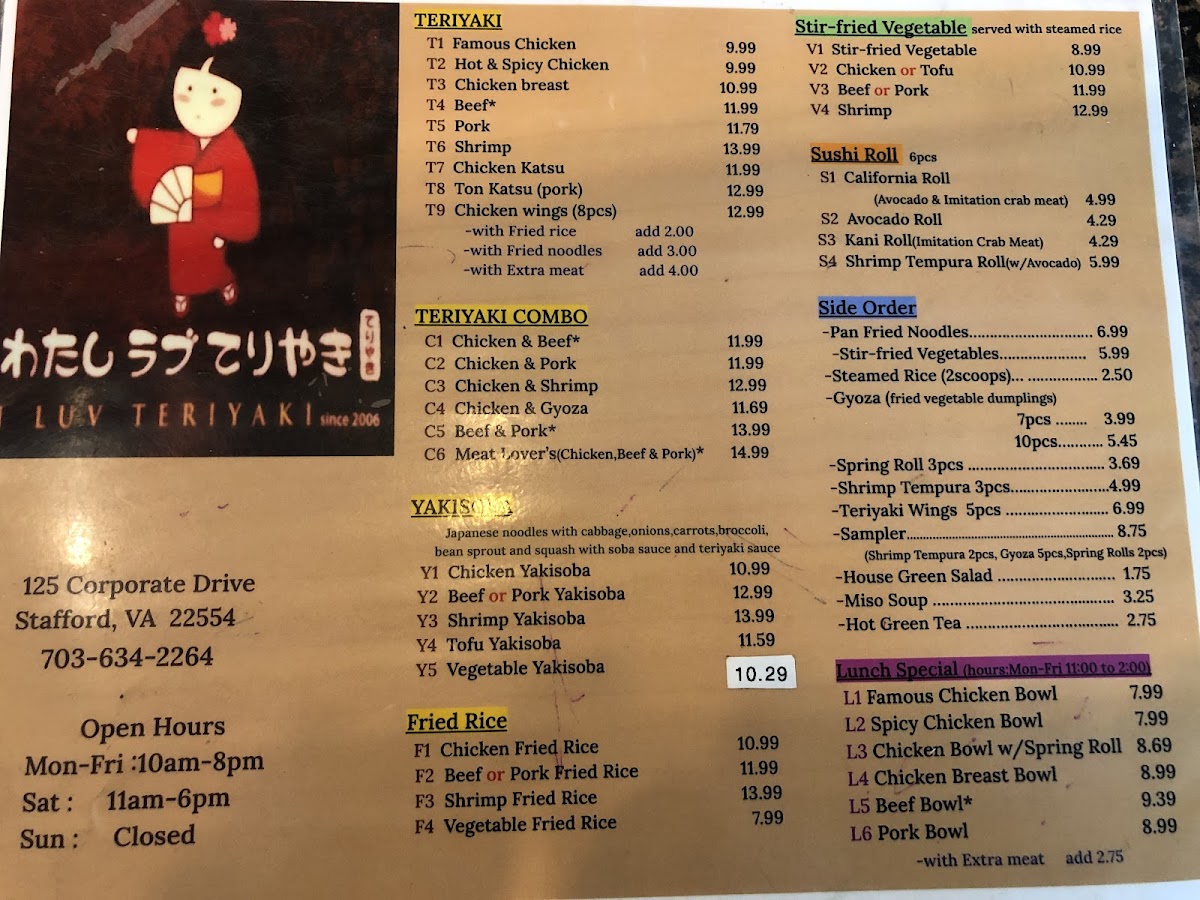 Welcome to I Luv Teriyaki, a hidden gem located at 125 Corporate Dr, Stafford, VA, where flavorful Asian cuisine meets a cozy atmosphere. This charming spot is renowned for its mouthwatering teriyaki chicken, which receives rave reviews for its tantalizing taste. Pair it with their fried rice for an enhanced experience—customers frequently recommend it over white rice for a perfect complement.